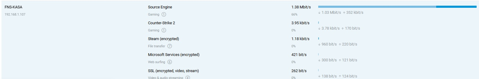 Regarding CS2 classification: after studying the diagnostics provided by you, it looks like UDP flows of gaming traffic were classified as "Source Engine", as they should be. Example: flow 611584 (U (17) 192.168.1.107:46517 -> 45.92.38.55:28016) classified as "Gaming":"Source Engine" (947) Please note, a significant amount of the traffic caused by Counter Strike 2 will be classified as Source Engine, the gaming engine on which the game is based. Can you double check whether Application Traffic Analyser shows “Source Engine” when a CS2 gaming session is in progress? -