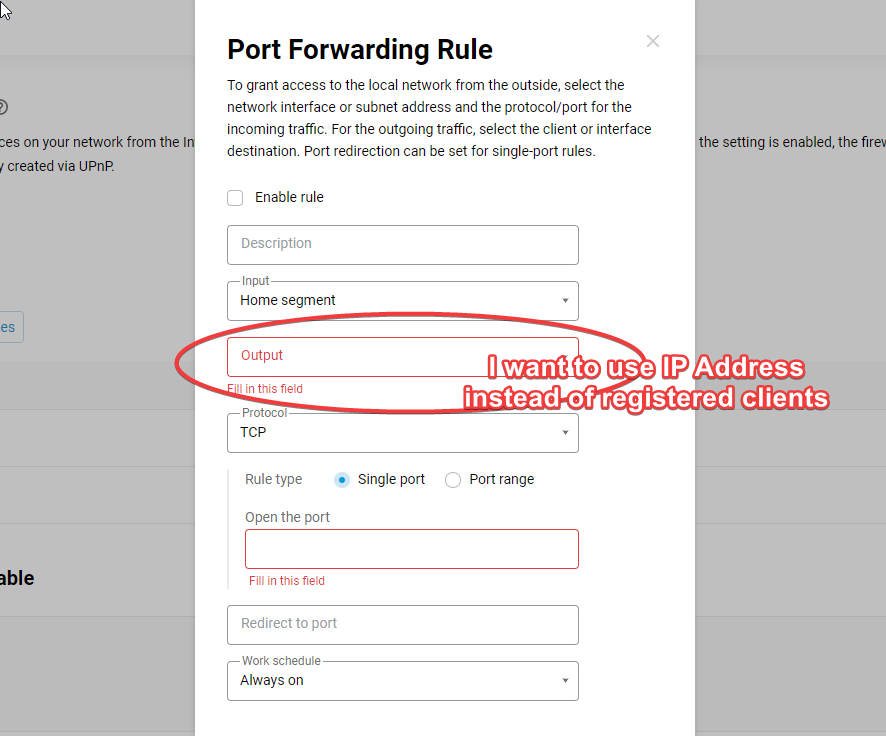 1. Hello, In Keenetic modem configuration, port forwarding requires selecting a Registered client, which is based on MAC address. When using a Keenetic Buddy Wi‑Fi extender, all devices behind its ethernet port appear with the same MAC address, so my virtual machines cannot be registered individually. I would like to: Register clients by IP address instead of MAC. Configure port forwarding rules directly to an IP address, not tied to a registered MAC client. Is this possible in Keenetic firmware, or is there any workaround for VM environments behind a Buddy extender where MAC addresses are duplicated? Thanks.
