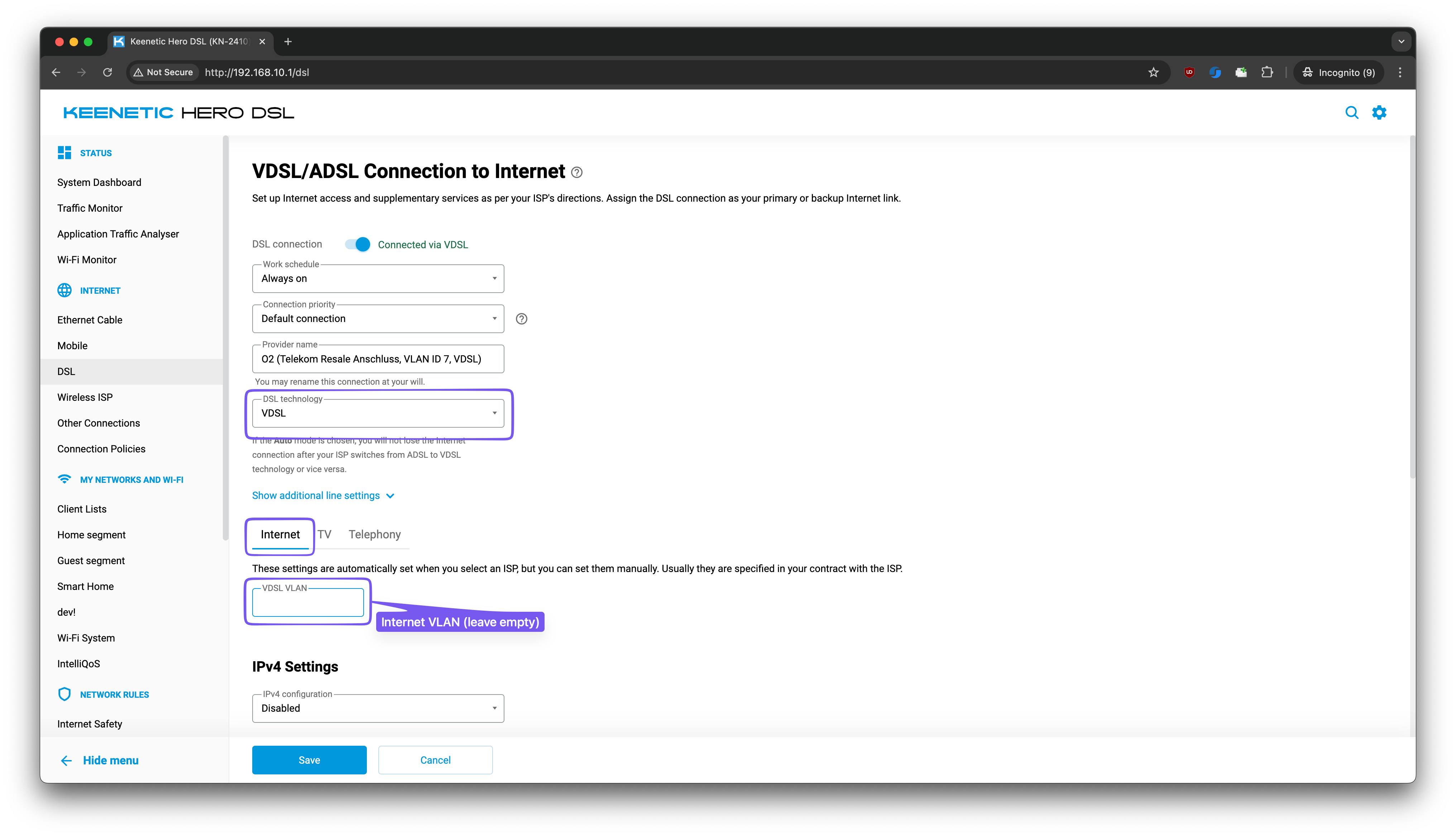 You can configure a configuration that you describe via the command line. It won't be possible to do it in the web UI. The resulting configuration file (startup-config) will contain something like this: ... interface Dsl0 rename DSL ip dhcp client dns-routes ip name-servers ... up ! ... interface Dsl0/Vlan0 security-level public ip address dhcp ip dhcp client dns-routes ip global 306 up ! interface Dsl0/Vlan123 security-level public ip address dhcp ip dhcp client dns-routes ip global 153 up ! ... However, I don't have enough expertise to answer any following questions about the setup you want. I kindly suggest that you contact our technical support: https://support.keenetic.com/ Our support engineers will be able to answer your questions better than I am. -