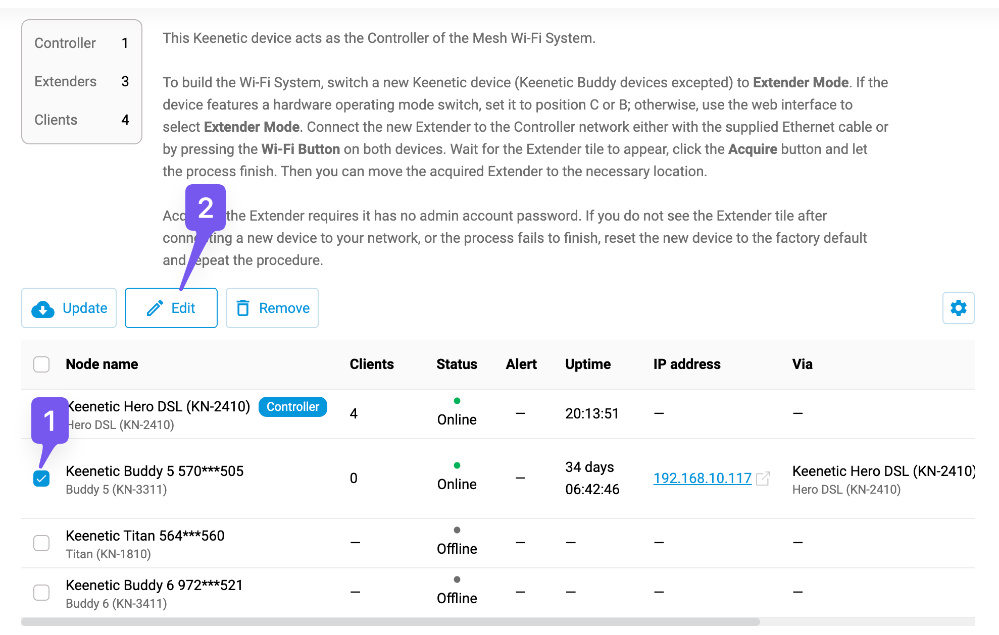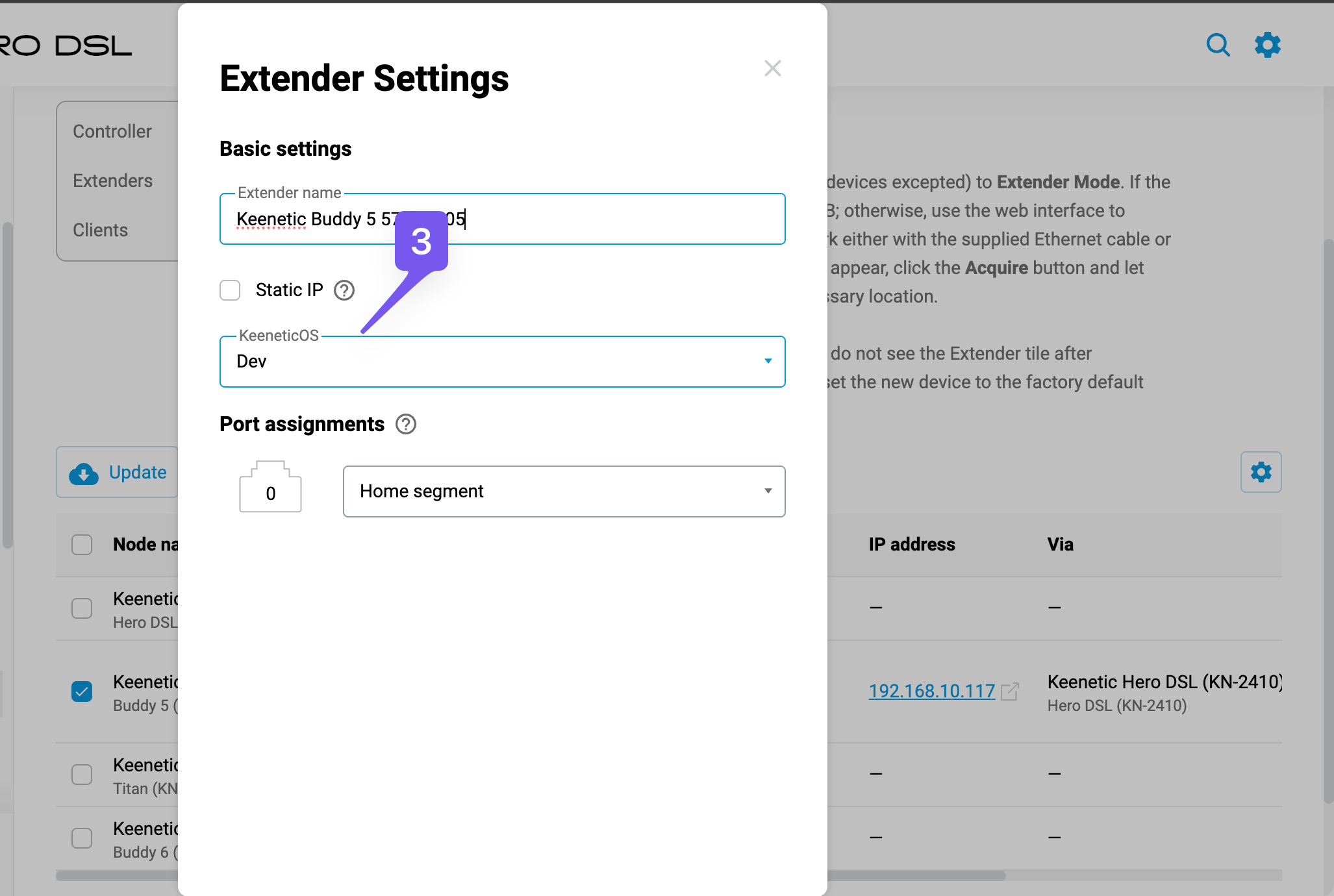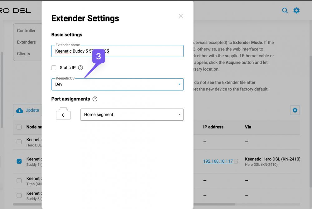 You can change the update channel for a member device like this: 1. Check the checkbox for the relevant member device in the nodes table. 2. Press the "Edit" button on top of the table. 3. Change the "KeeneticOS" dropdown value to the desired update channel (Dev in my example) in the device settings dialog. 4. Press the "Save" button at the bottom of the device settings dialog. -