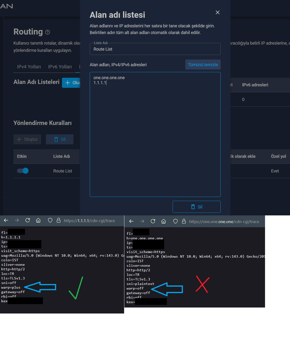 Hello, I'd like to report an issue with the DNS-based route addition page. I configured my Warp Wireguard connection as shown in the image. Both initially worked without issue, but after turning the setting off and on, adding new domains, or deleting and re-adding them completely, the "domain" redirection in the route list became corrupted. Even deleting profile and re-adding them didn't work properly. The IP side appears to be working fine. Do you experience this issue as well? I'd appreciate it if you could try it and report back.
